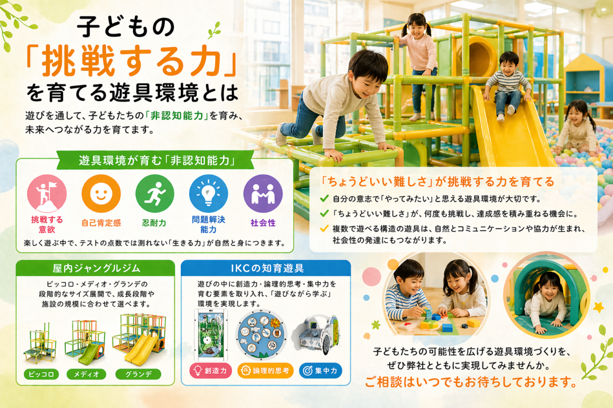 近年、教育の現場では「非認知能力」への注目が高まっています。非認知能力とは、テストの点数では測れない、忍耐力・自己肯定感・挑戦する意欲・問題解決能力といった、人生を豊かにする根本的な力のことです。そしてこれらの力を育む場として、遊び場・遊具環境が果たす役割は非常に大きいとされています。